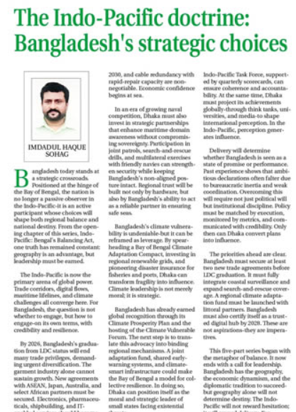 Bangladesh’s future is no longer tethered solely to its fields and factories. Its sovereignty, security, and strategic relevance now depend on its ability to govern, command and compete at sea, writes Abdul Monaiem Kudrot Ullah [Source : New age, 20 August 2025]